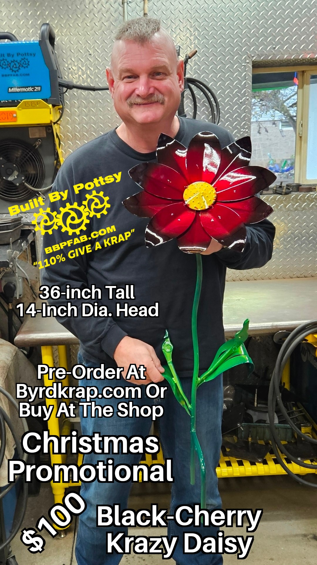 **LIMITED TIME** PICK UP AT THE SHOP! DEPOSIT ($50) WITH REMAINDER DUE ($50) AT THE SHOP WHEN YOUR ORDER IS READY! Our NEW Christmas Promotional Legacy Krazy Daisy Flower! *NOTICE* This is a PRE-ORDER Item! It will be ready for PICK UP in 7-10 Business Days Once Ordered! You will receive a call or email letting you know when your flower is available to pick up. Black-Cherry Krazy Daisy Legacy Flower Has A Bright Yellow Center With Cherry Berry Petals That Fade To Black Cherry. Each is proudly handcrafted in the United States of America, signed, dated serial numbered, powder coated, 36 inches tall prior to planting, and has a flower head diameter of 14 inches!