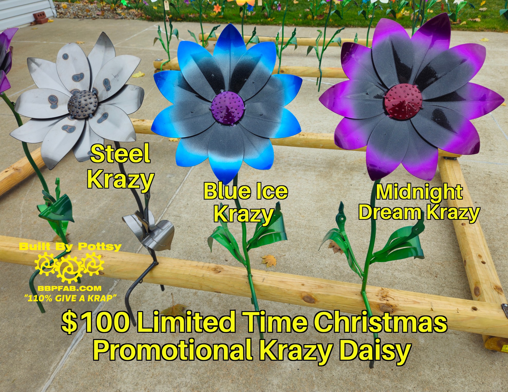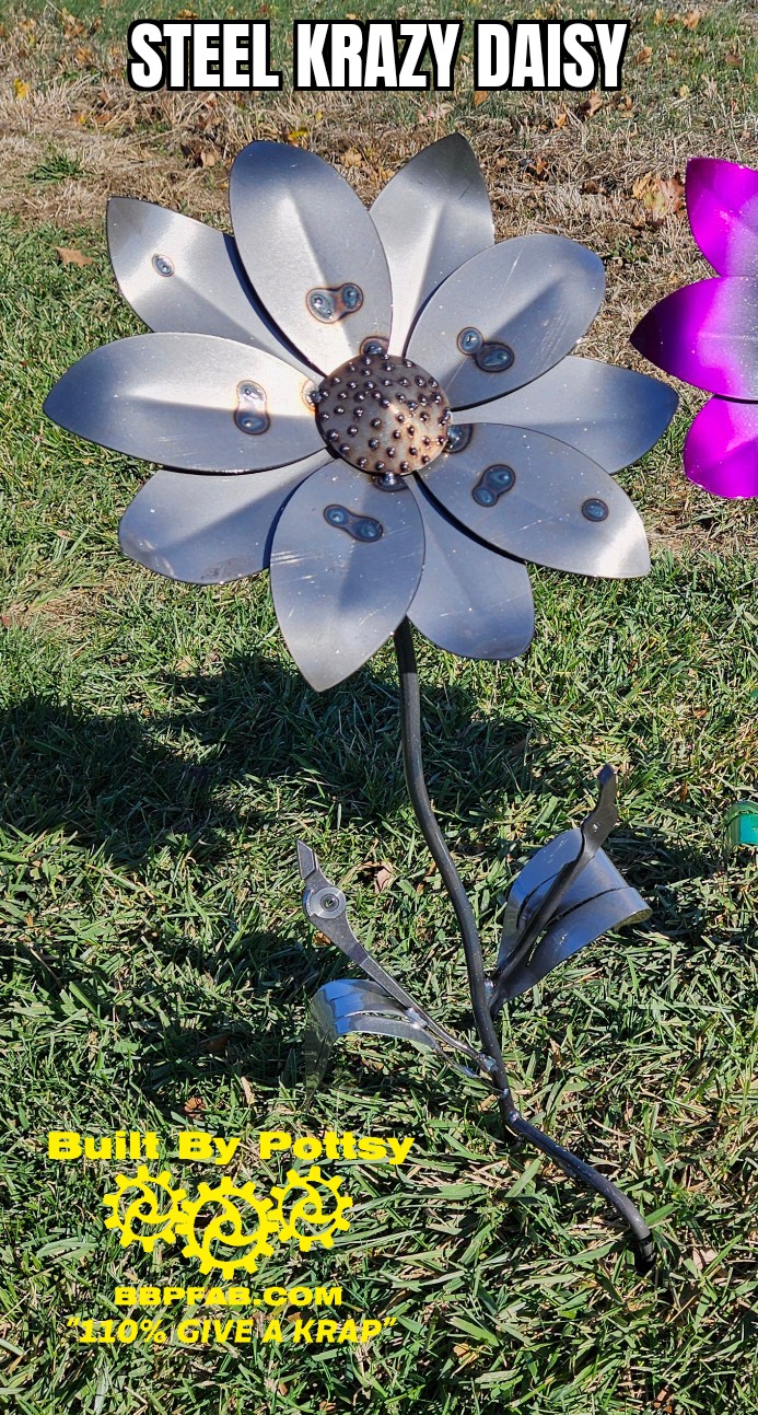 **LIMITED TIME** PICK UP AT THE SHOP! DEPOSIT ($50) WITH REMAINDER DUE ($50) AT THE SHOP WHEN YOUR ORDER IS READY! Our NEW Christmas Promotional Legacy Krazy Daisy Flower! *NOTICE* This is a PRE-ORDER Item! It will be ready for PICK UP in 7-10 Business Days Once Ordered! You will receive a call or email letting you know when your flower is available to pick up. Plum Krazy Daisy Legacy Flower Has A Bright Yellow Center With Cream White Petals That Fade To Awesome Purple. Each is proudly handcrafted in the United States of America, signed, dated serial numbered, powder coated, 36 inches tall prior to planting, and has a flower head diameter of 14 inches!