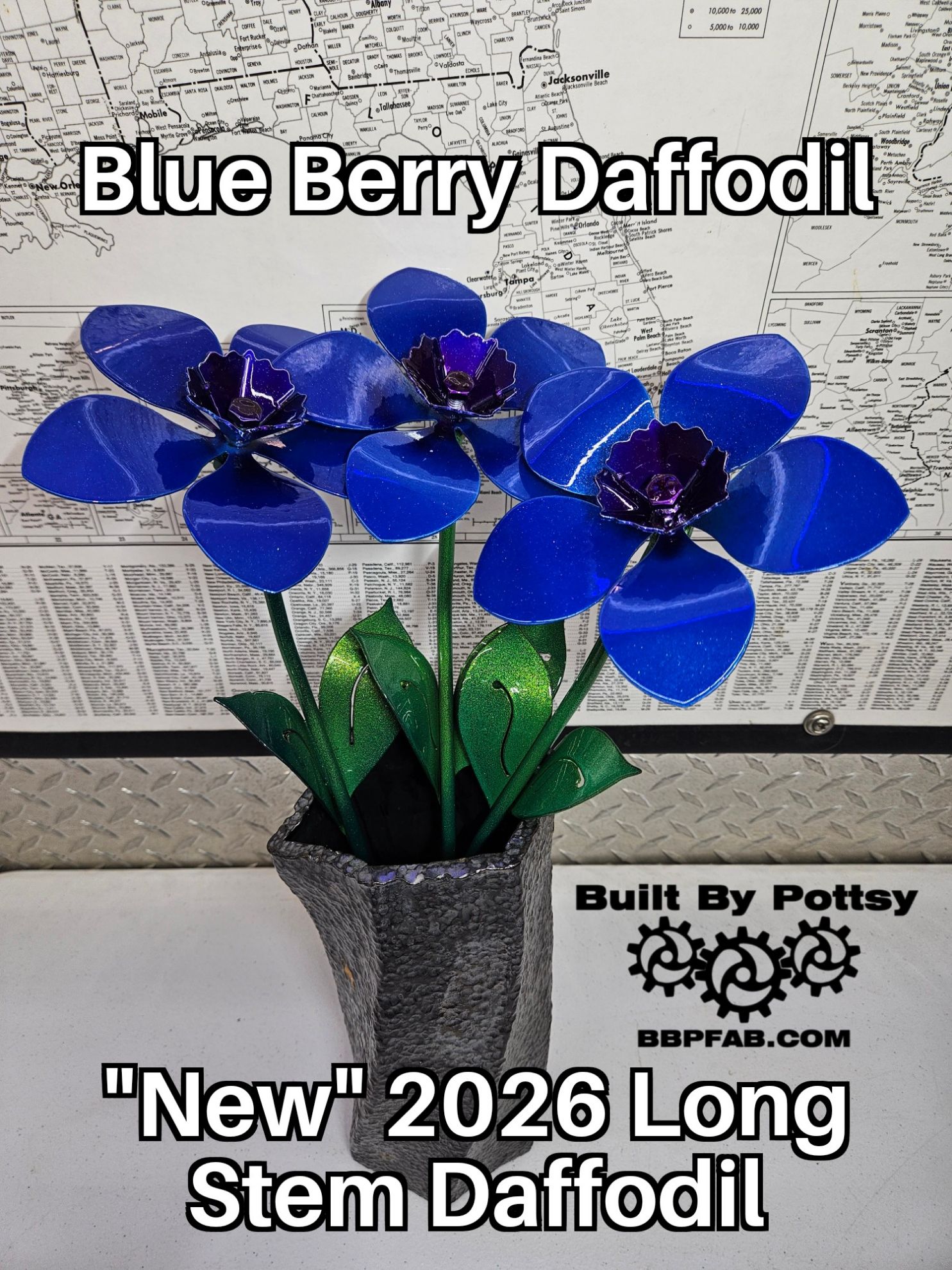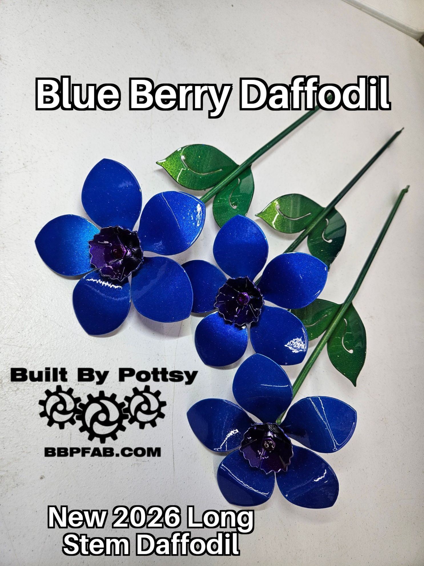 Our NEW Long Stem Daffodi is Made To Order" as well as proudly handcrafted in the United States of America. Each is Daffodi is 18 inches tall with a 5 inch diameter flower head. We proudly Powder Coat to vivid colors.