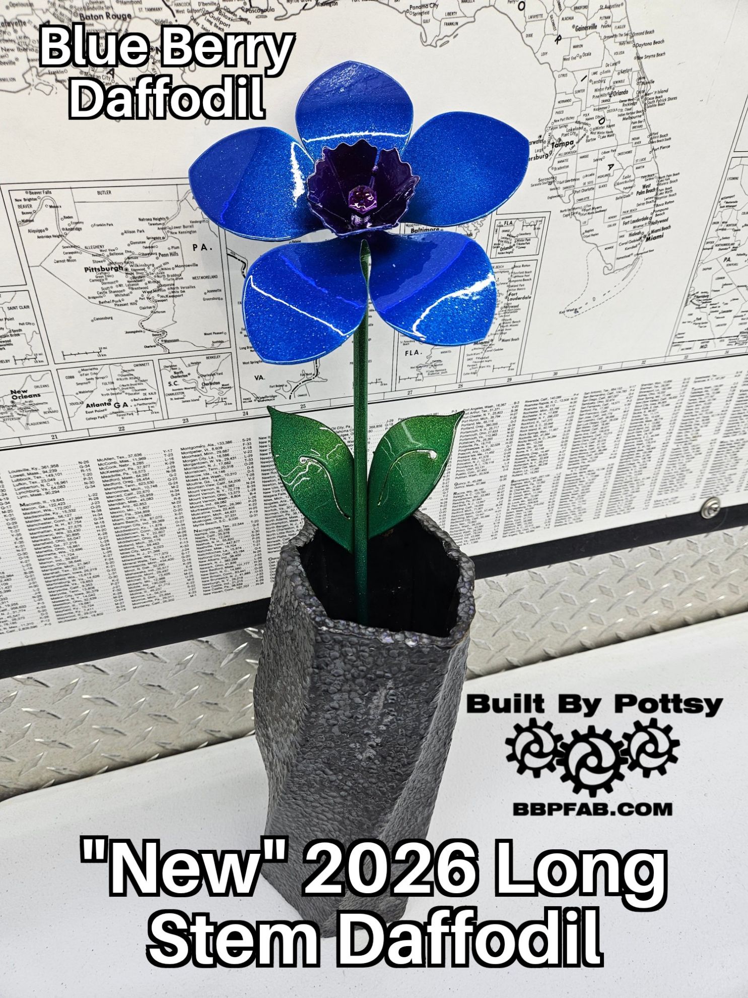 Our NEW Long Stem Daffodi is Made To Order" as well as proudly handcrafted in the United States of America. Each is Daffodi is 18 inches tall with a 5 inch diameter flower head. We proudly Powder Coat to vivid colors.