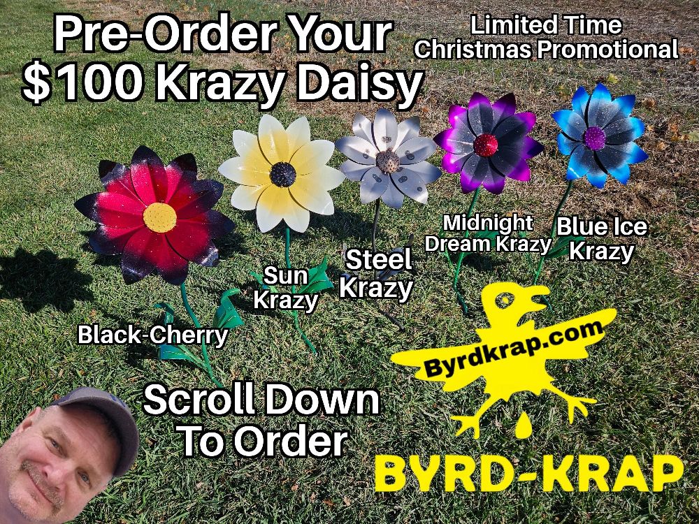 **LIMITED TIME** PICK UP AT THE SHOP! DEPOSIT ($50) WITH REMAINDER DUE ($50) AT THE SHOP WHEN YOUR ORDER IS READY! Our NEW Christmas Promotional Legacy Krazy Daisy Flower! *NOTICE* This is a PRE-ORDER Item! It will be ready for PICK UP in 7-10 Business Days Once Ordered! You will receive a call or email letting you know when your flower is available to pick up. Black-Cherry Krazy Daisy Legacy Flower Has A Bright Yellow Center With Cherry Berry Petals That Fade To Black Cherry. Each is proudly handcrafted in the United States of America, signed, dated serial numbered, powder coated, 36 inches tall prior to planting, and has a flower head diameter of 14 inches!