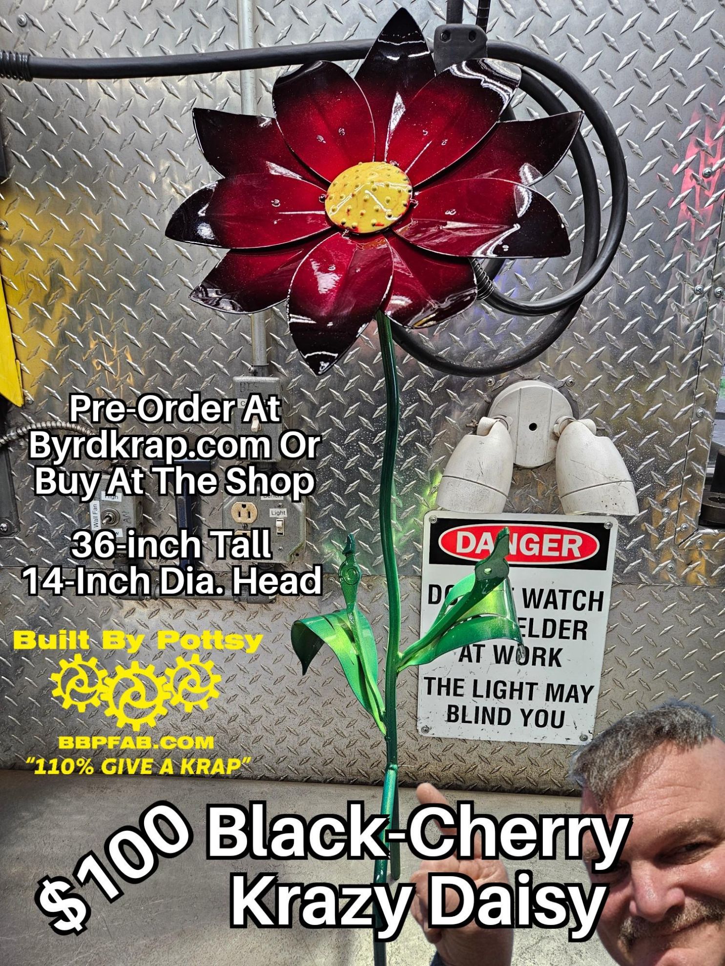 **LIMITED TIME** PICK UP AT THE SHOP! DEPOSIT ($50) WITH REMAINDER DUE ($50) AT THE SHOP WHEN YOUR ORDER IS READY! Our NEW Christmas Promotional Legacy Krazy Daisy Flower! *NOTICE* This is a PRE-ORDER Item! It will be ready for PICK UP in 7-10 Business Days Once Ordered! You will receive a call or email letting you know when your flower is available to pick up. Black-Cherry Krazy Daisy Legacy Flower Has A Bright Yellow Center With Cherry Berry Petals That Fade To Black Cherry. Each is proudly handcrafted in the United States of America, signed, dated serial numbered, powder coated, 36 inches tall prior to planting, and has a flower head diameter of 14 inches!
