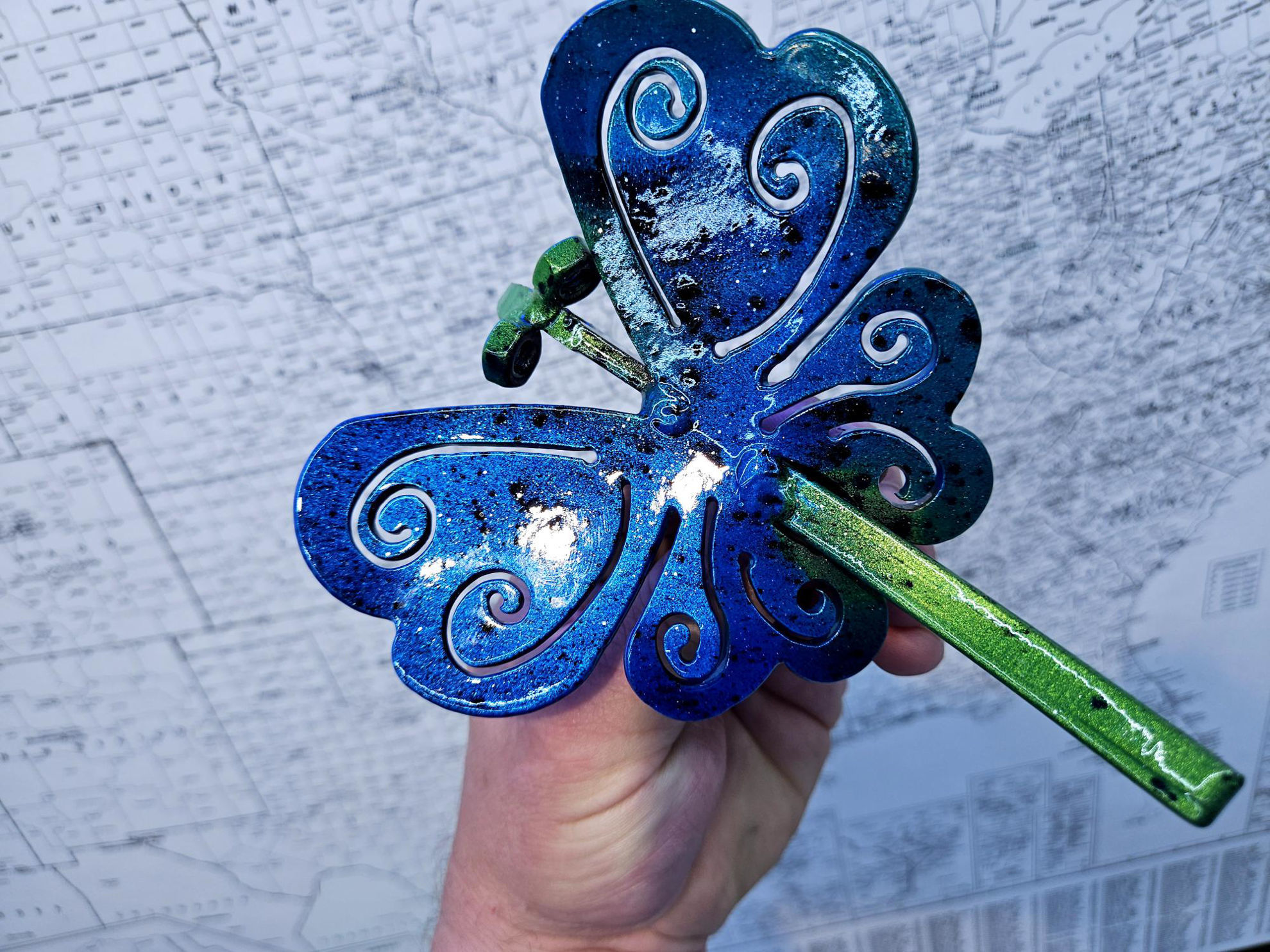 Blue -Stem Nymph Butterfly Our Stem Nymphs are each proudly handcrafted in the United States of America! They are roughly 6-inches long, 5-inches with vivid powder coat coloring.